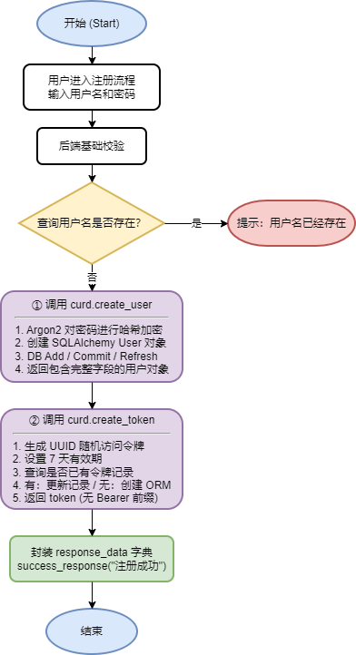 用户输入用户名和密码,后端会先通过Pydantic验证数据模型,不通过报错,通过后,再查询用户名是否存在,如果存在,提示用户名已经存在,如果不存在