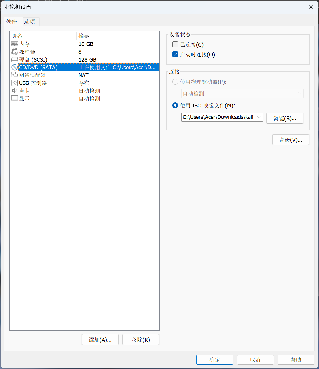 虚拟机用户建议在设置中将CD/DVD选项删除或者改为自动检测(关机更改)