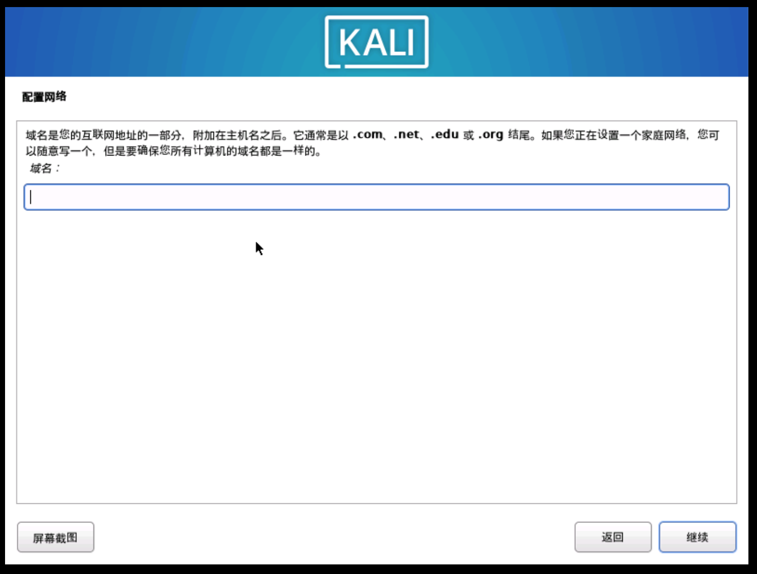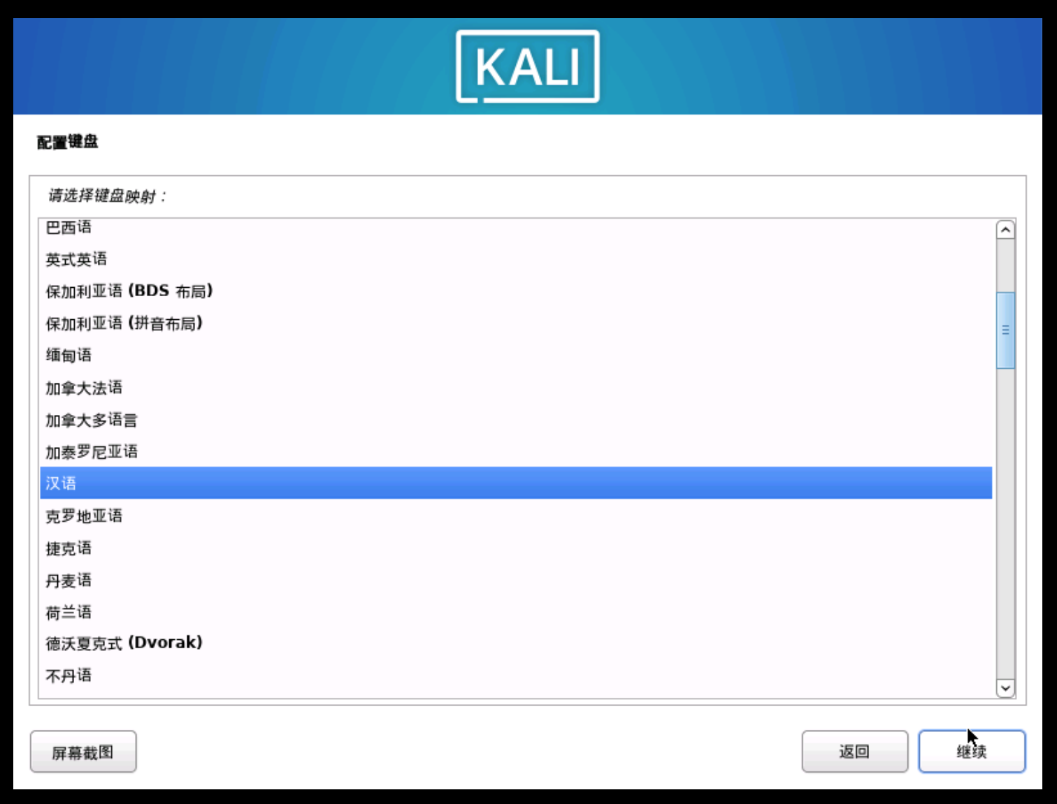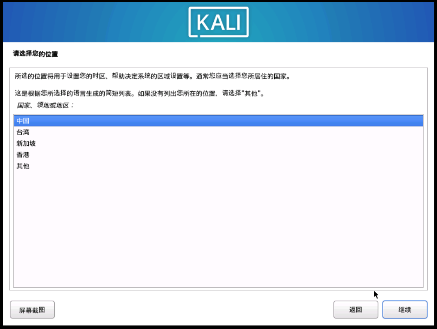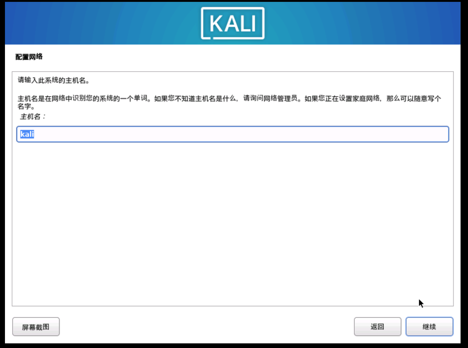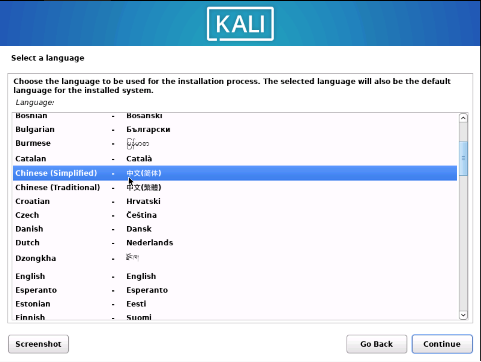选择中文简体,Continue(或者有基础,并且后期对文件夹定向cd指令有英文需求(例如:cd home/kali/downloads而不是cd home/kali/下载),可以先选择英文,后期再改中文(参考详细配置一文))