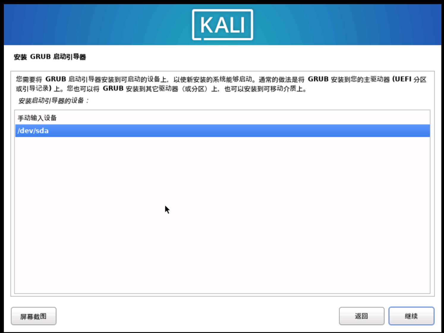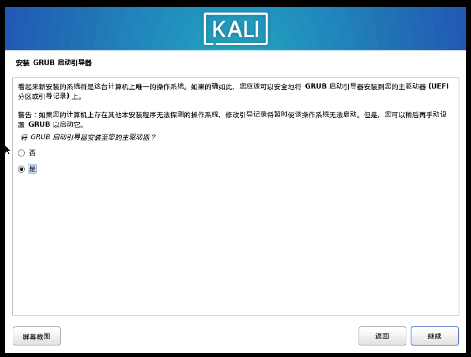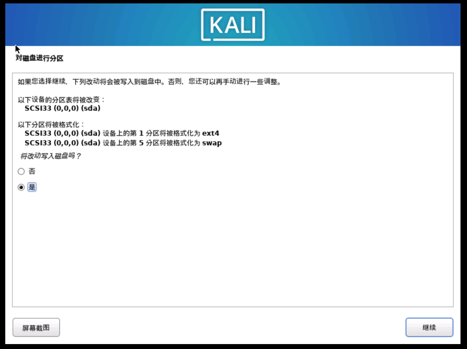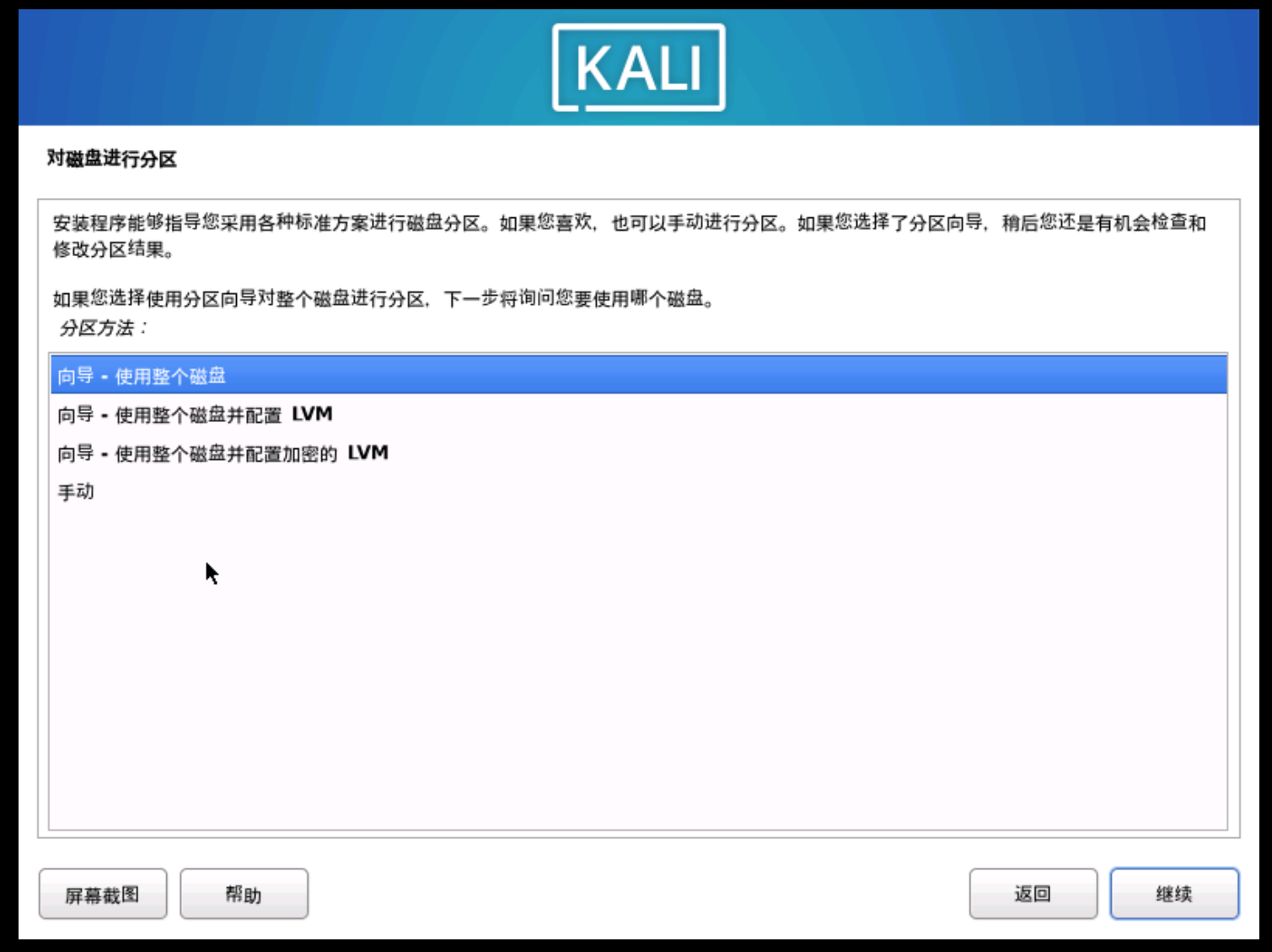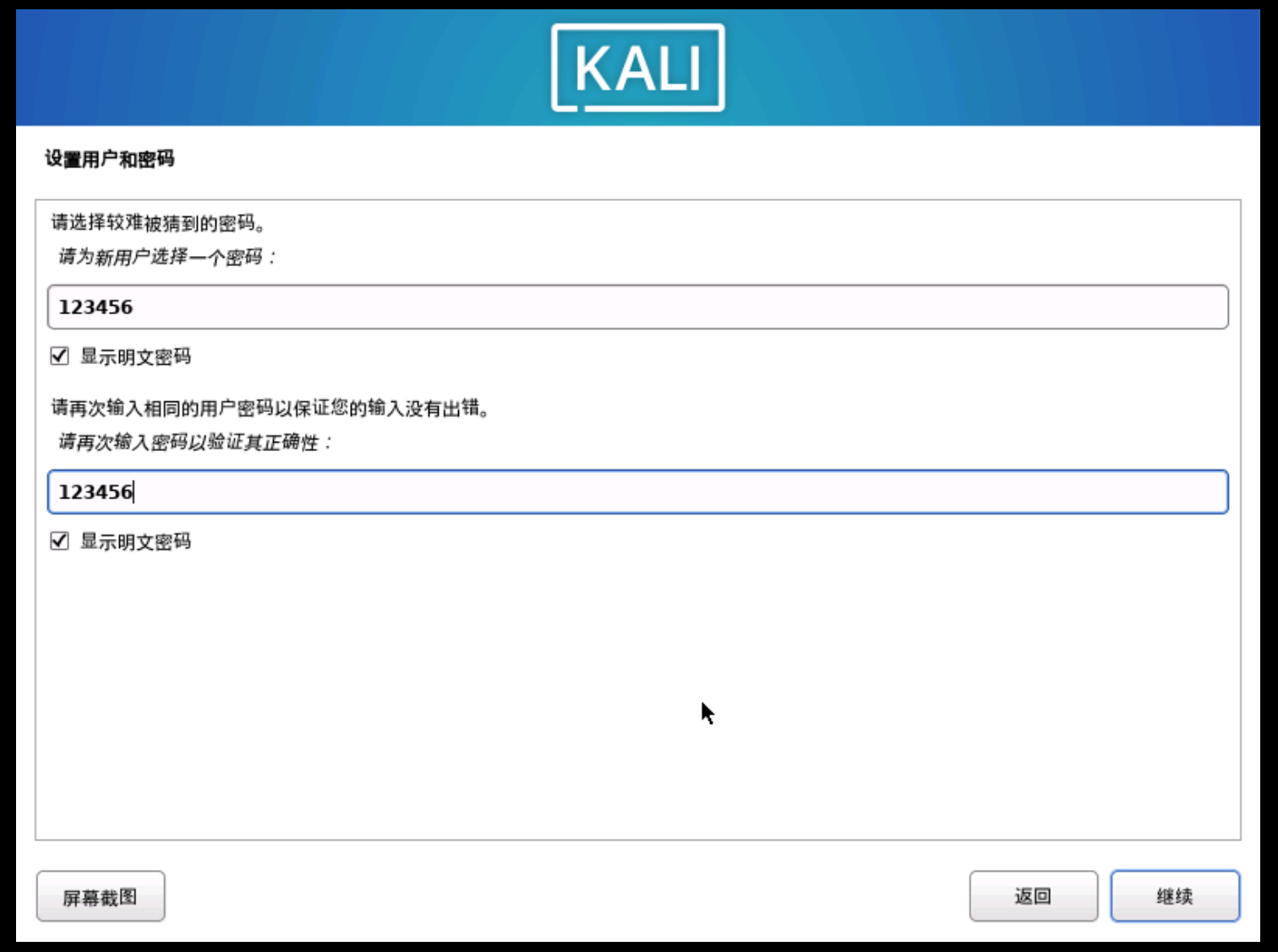 选择中文简体,Continue(或者有基础,并且后期对文件夹定向cd指令有英文需求(例如:cd home/kali/downloads而不是cd home/kali/下载),可以先选择英文,后期再改中文(参考详细配置一文))