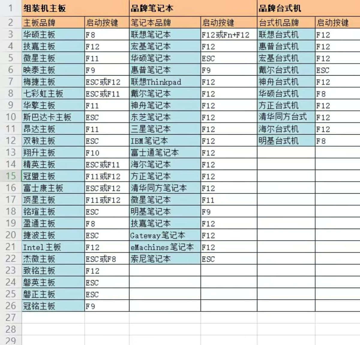 将U盘插入待安装电脑,开机后进入BIOS(下附各品牌BIOS进入键)(注:开机亮屏就快速重复点击启动按键,直到进入BIOS)