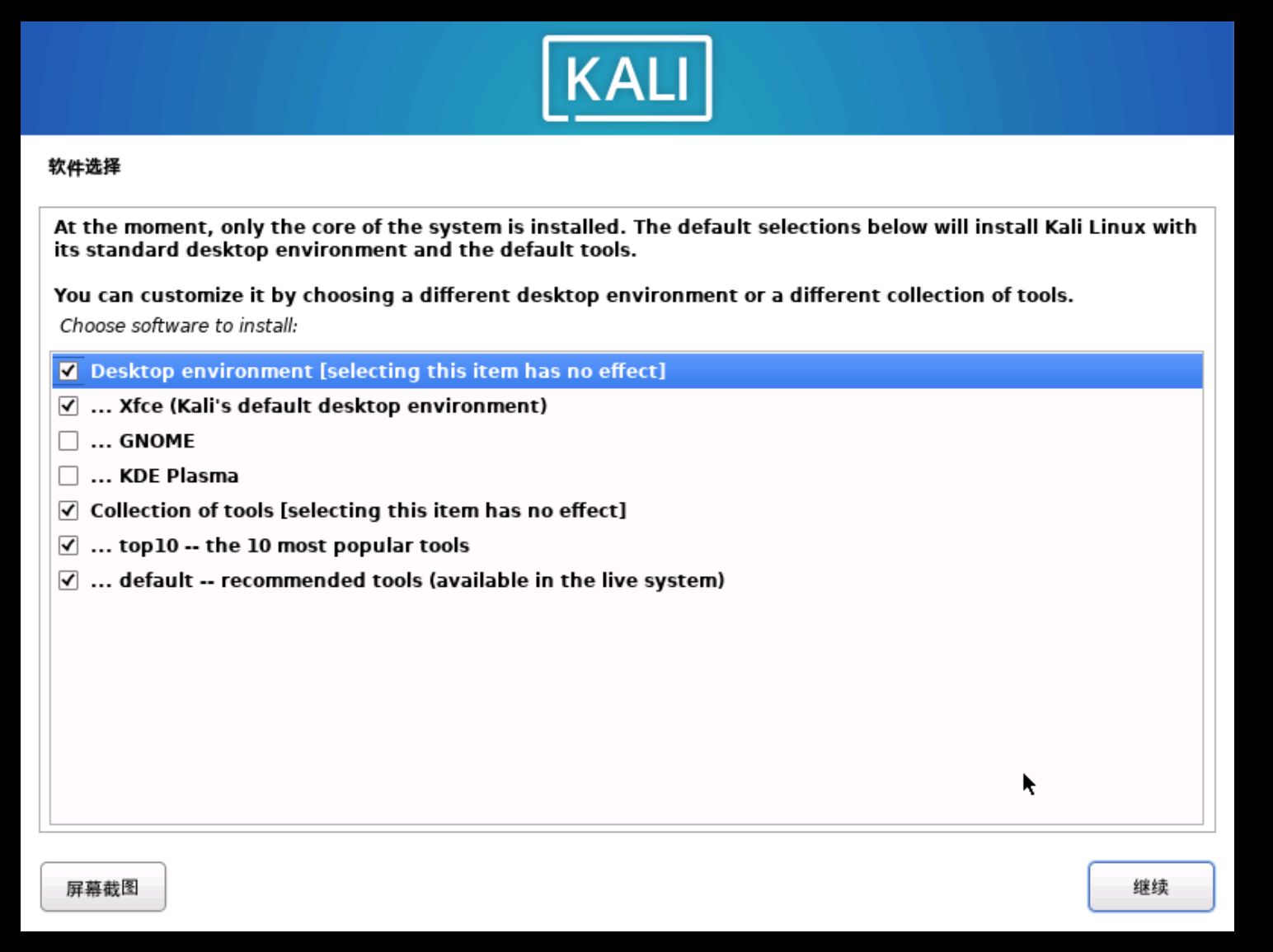 这一步是选择桌面环境的,建议Xfce桌面环境,轻量级,好用;KDE的话支持定制,但是依赖要自己安装。以及后面附带的是工具集