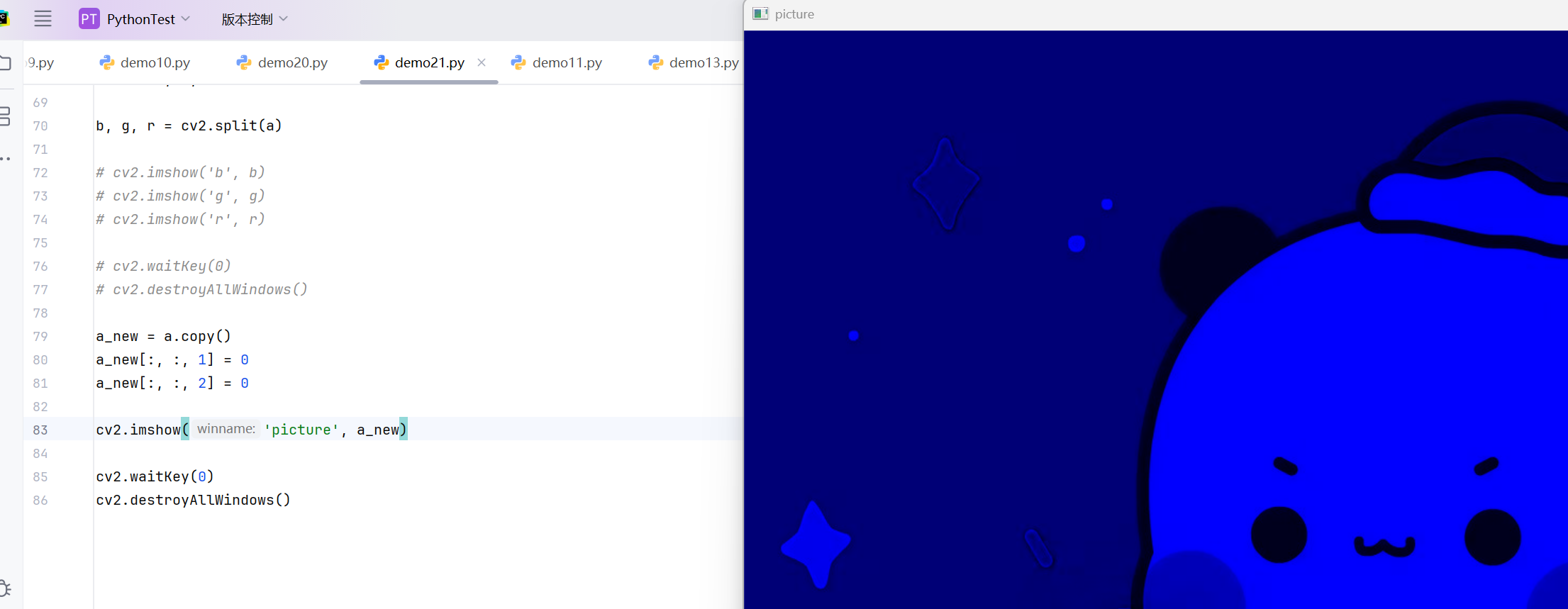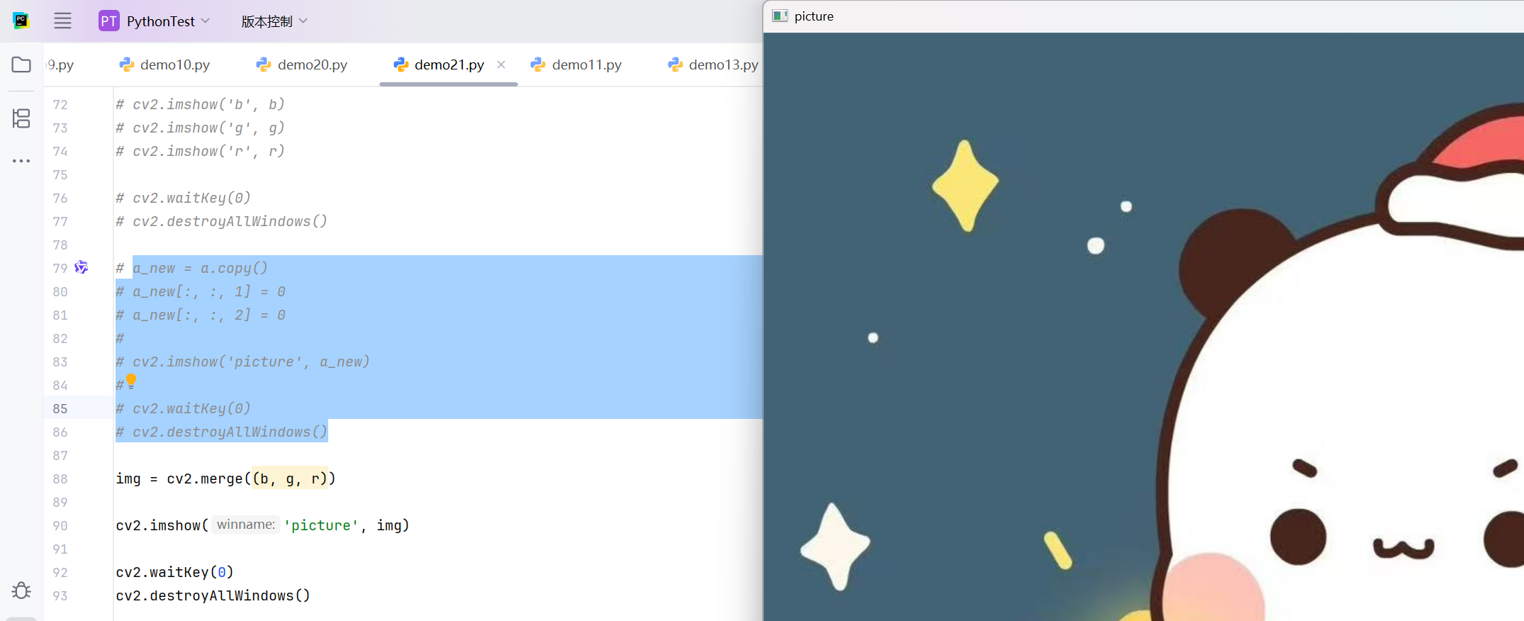cv2.split(img):将多通道图像拆分为单通道数组列表。cv2.merge(mv):将多个单通道数组合并为多通道图像,参数为通道元组(如(b, g, r))。