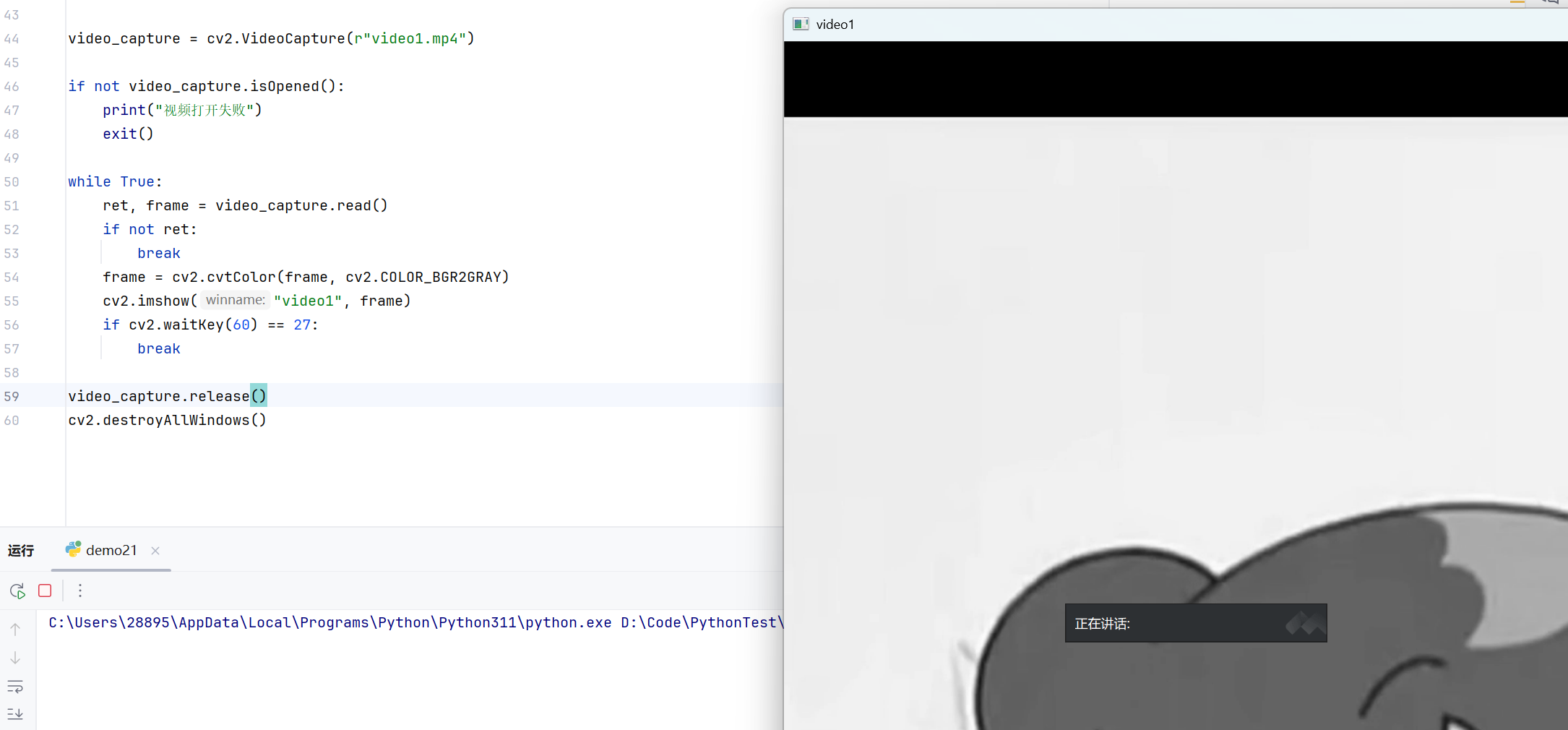 if cv2.waitKey(60) == 27: # 每帧显示约 60ms,按 ESC 退出