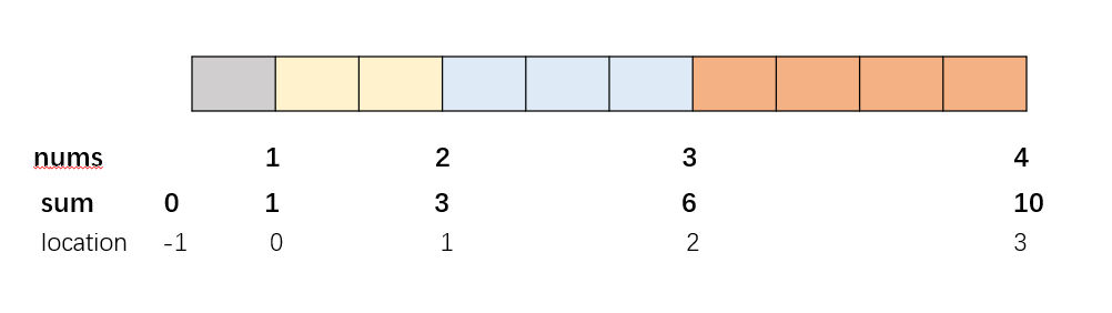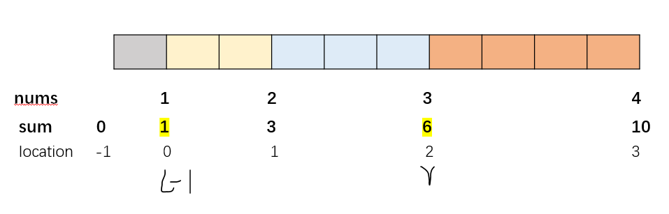 比如我们想知道2+3的和,也就是nums[1]+nums[2]的和,观察可知我们要算黄色加蓝色色块的长度,也就是sum(2)-sum(0)=6-1=5