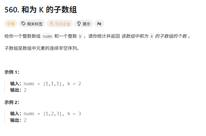 最直接的暴力思路是:枚举每一个起点,再向右扩展终点,计算每一段区间的和,看是否等于 k。但这种做法时间复杂度是 O(n2),在数据规模较大时会超时。