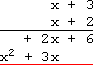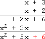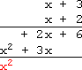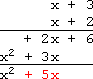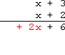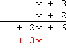用下方的 + 2 +2 +2 乘以上方的 x x x,得到结果 + 2 x +2x +2x 并写下:
