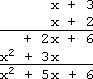 ( x + 3 ) ( x + 2 ) = ( x + 3 ) ( x ) + ( x + 3 ) ( + 2 ) = x ( x ) + 3 ( x ) + x ( + 2 ) + 3 ( + 2 ) = x 2 + 3 x + 2 x + 6 = x 2 + 5 x + 6 \begin{align*} (x + 3)(x + 2) = & (x + 3)(x) + (x + 3)(+2) \\ = & x(x) + 3(x) + x(+2) + 3(+2) \\ = & x^{2} + 3x + 2x + 6 \\ = & x^{2} + 5x + 6 \end{align*} (x+3)(x+2)====(x+3)(x)+(x+3)(+2)x(x)+3(x)+x(+2)+3(+2)x2+3x+2x+6x2+5x+6