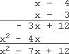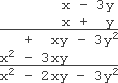 ( x 2 ) + ( x y ) + ( − 3 x y ) + ( − 3 y 2 ) = x 2 − 2 x y − 3 y 2 \begin{align*} &(x^{2}) + (xy) + (-3xy) + (&-3y^{2})\\ =& x^{2} \qquad -2xy &- 3y^{2} \end{align*} =(x2)+(xy)+(−3xy)+(x2−2xy−3y2)−3y2