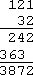 例如,计算 121 × 32 121 \times 32 121×32 时,横向计算会非常繁琐,而竖式计算则十分简便: