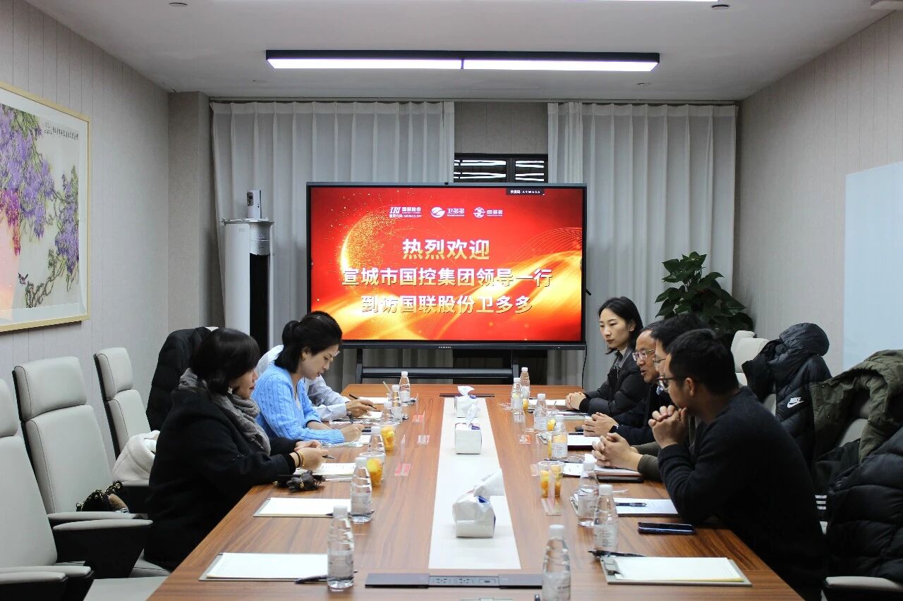 12月18日,宣城市国控集团党委书记、董事长钱邦青一行到访国联股份卫多多,国联股份副总裁、卫多多/纸多多CEO黄莎莎,卫多多产发部总经理许德荣等热情招待来访一行,并展开深入交流。