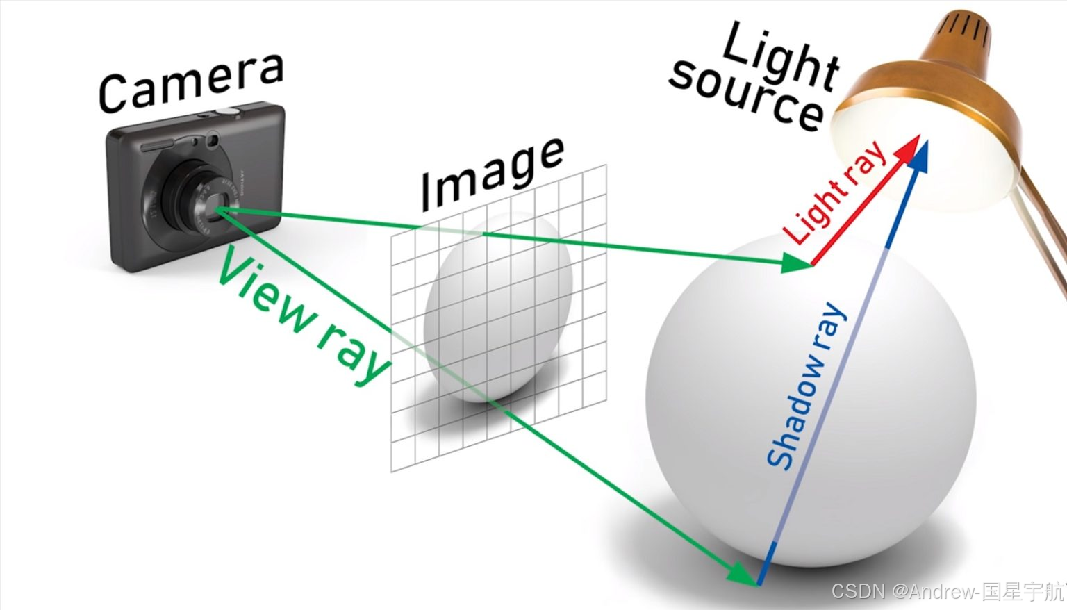 我们肉眼看到物体,本质是「光源发出的光线照射到物体上,经过反射/折射后进入眼睛」。但直接模拟这个过程(从光源出发追踪光线)效率极低------大部分光线不会刚好进入眼睛。