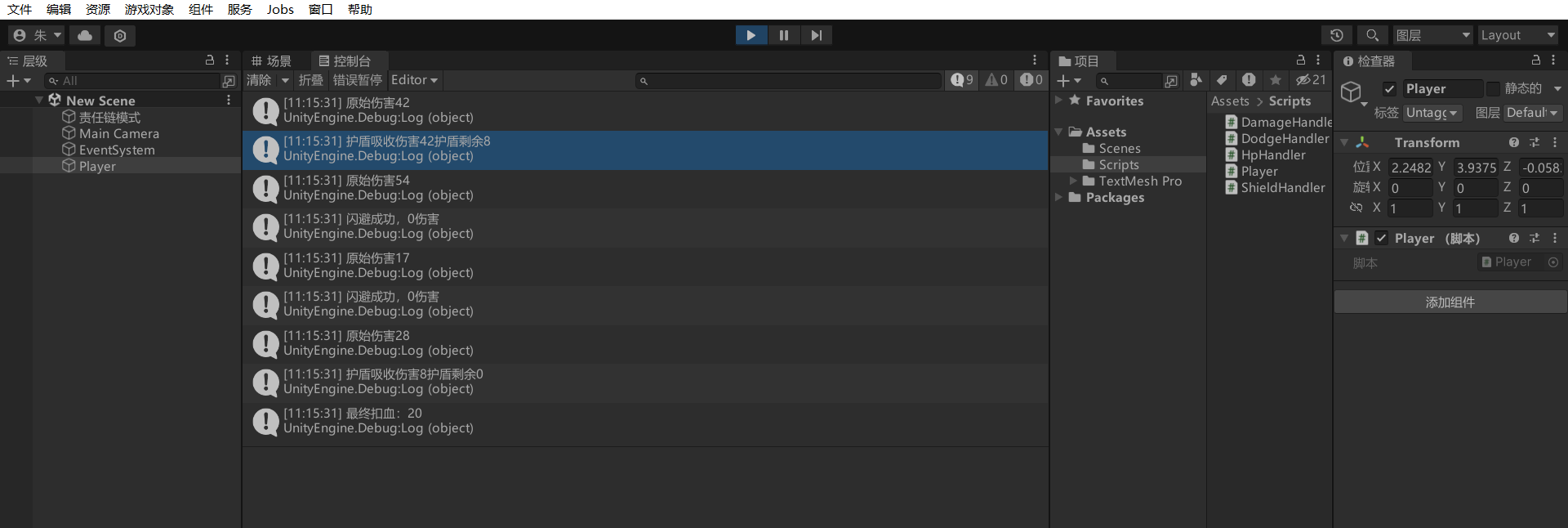 将Player脚本加到场景中的一个空对象上然后运行游戏按下空格,可以看到一些列的伤害处理过程被打印了出来,并且护盾扣完过后并就无法提供多余的减伤了,符合游戏逻辑。