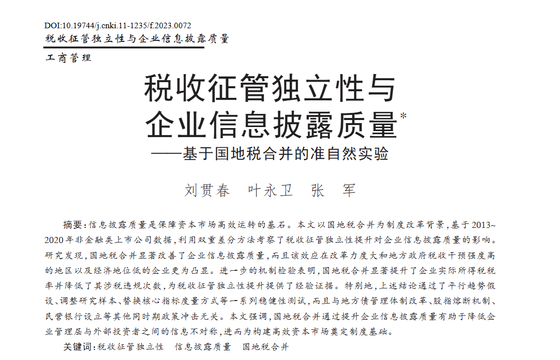 税收征管独立性与企业信息披露质量------基于国地税合并的准自然实验_刘贯春.pdf