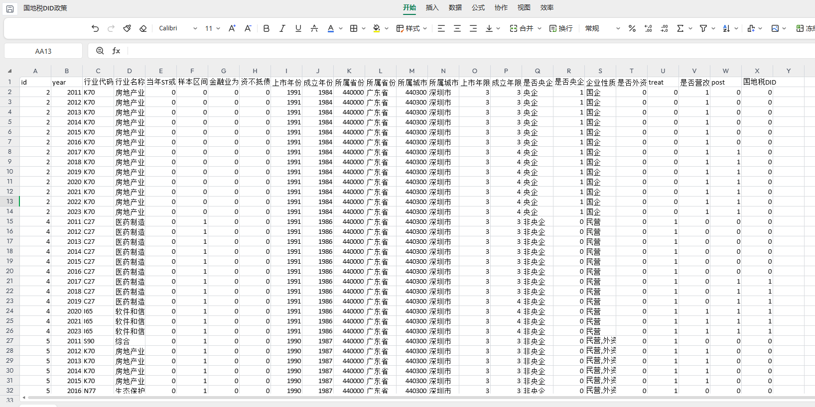 id year 行业代码证监会2012年版 行业名称证监会2012年版 当年ST或PT为1否则为0 样本区间内ST或PT为1否则为0 金融业为1否则为0 资不抵债为1否则为0 上市年份 成立年份 所属省份代码 所属省份 所属城市代码 所属城市 上市年限 成立年限 是否央企 是否央企2 企业性质 是否外资 treat 是否营改增行业 post 国地税DID