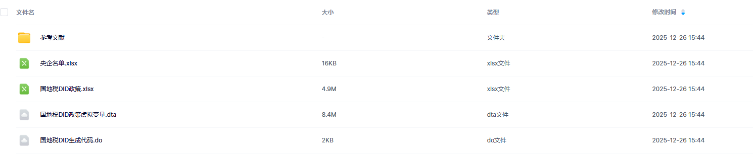 数据简介:参考刘贯春做法将2017年视为政策冲击的第一年,当年及之后年份赋值为1,此前年份赋值为0。国地税合并前企业所得税由地税局征管的企业赋值为1(实验组),其余赋值为0(对照组)。具体划分依据2008年后注册企业:按流转税类型归属(增值税→国税局,营业税→地税局),合并后新税务机构延续国税局管理模式,故地税原管企业受影响显著,符合实验组特征。