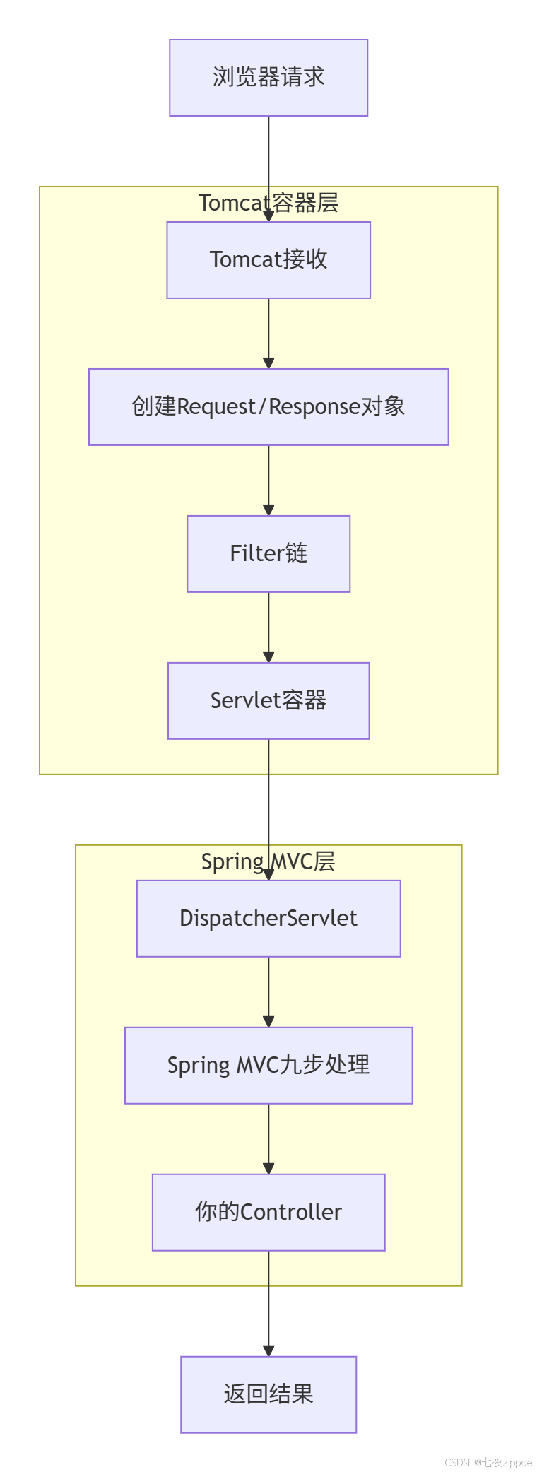 很多人以为请求直接就到Controller了,其实中间隔了好几层。咱们先看张图: