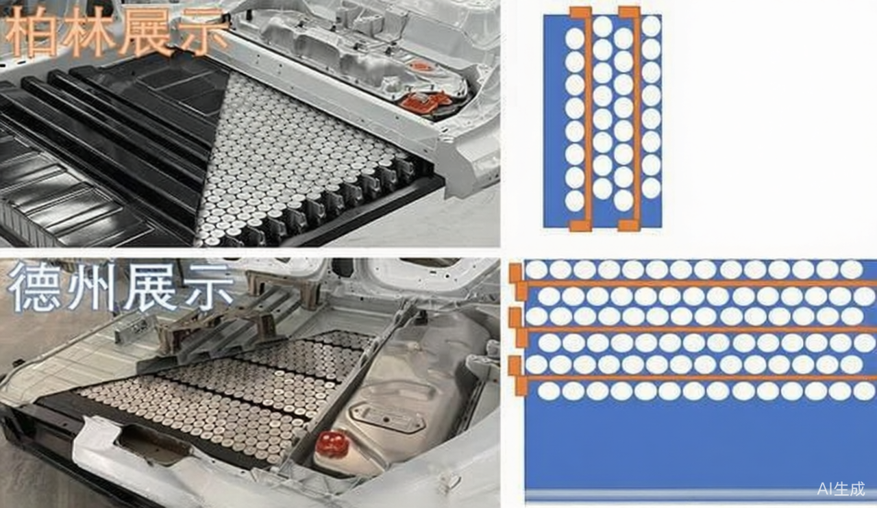 以下是4680的两种布置形式,也就是横置和竖置的两种模式,对应两种不同的水冷板,在整车的X和Y方向两种不同的模式布置。