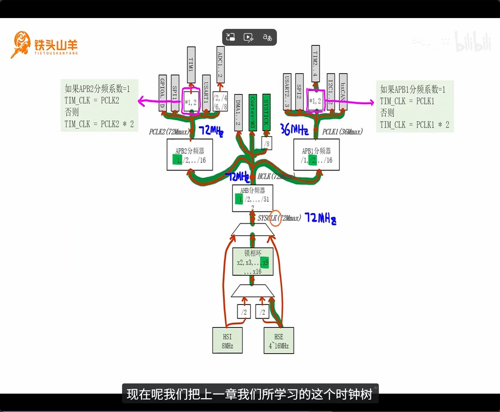 (上电启动默认)APB1=2 分频,则 TIM_CLK=PCLK1 * 2=36MHZ * 2 =72MHZ