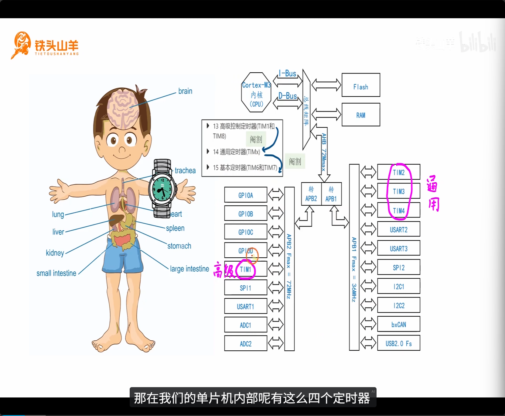 STM32F1 系列 MCU 最多有 14 个定时器(最小系统版有四个,为上图中的 1 个高级定时器,3 个通用定时器)。定时器也是个片上外设。