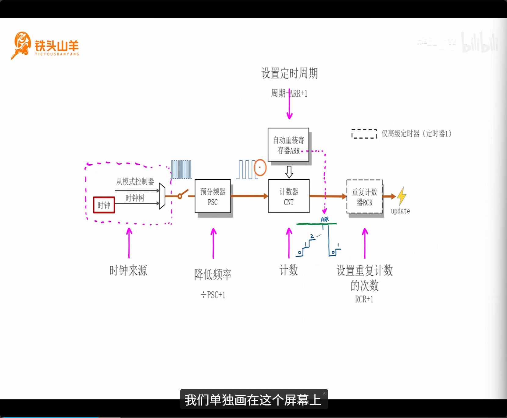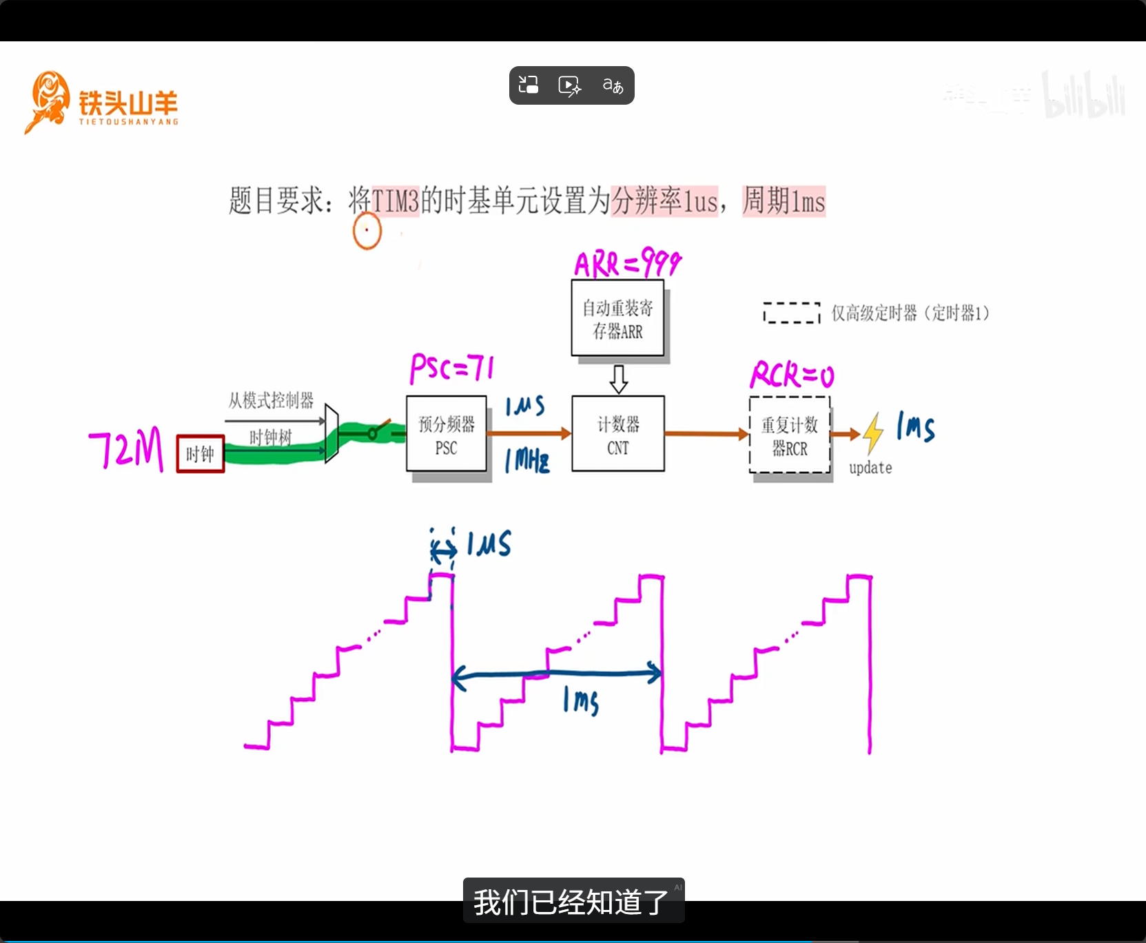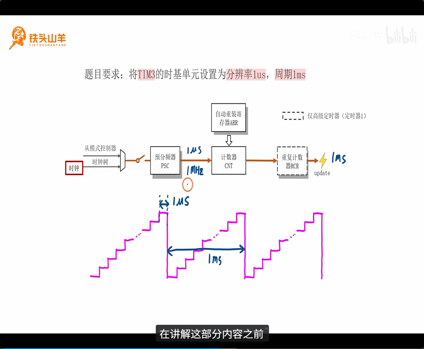 所以 CNT 递增一下(秒针)就是分辨率 1us,CNT 到 ARR+1 溢出(秒针转一圈),就是周期 1ms