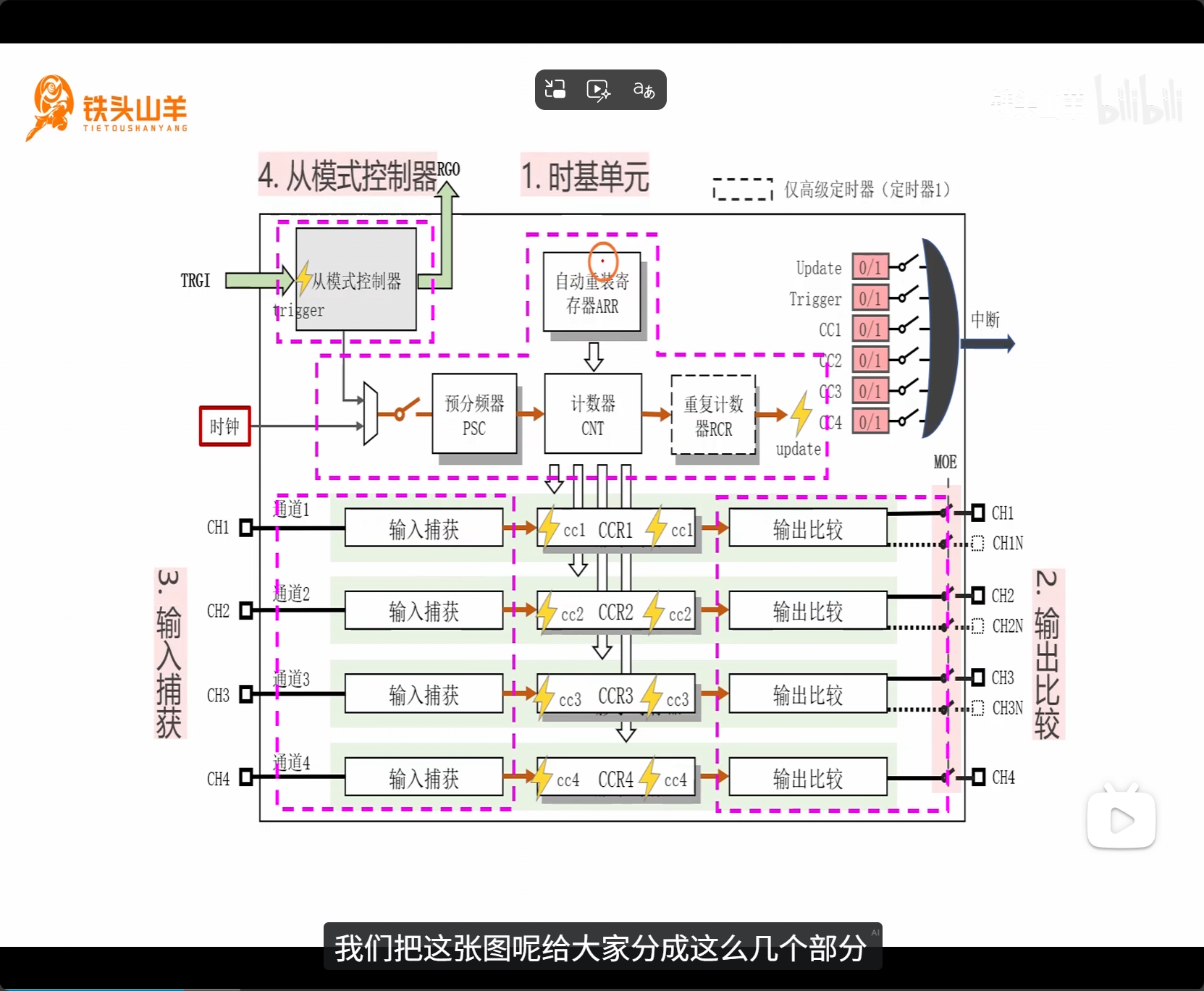 比较复杂,可拆分成四个部分:时基单元、输出比较、输入捕获、从模式控制器。