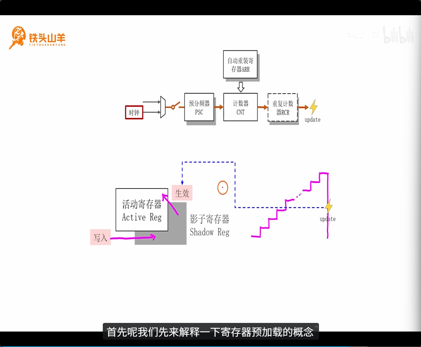 我们给寄存器写值的时候,是写入到影子寄存器的,而且这个值不会立即生效,直到 CNT 溢出产生一个 update 事件的时候,影子寄存器的值才会进入到活动寄存器(为啥这样设计啥意思啊。。。)。这种缓存的机制,就叫做寄存器的预加载。