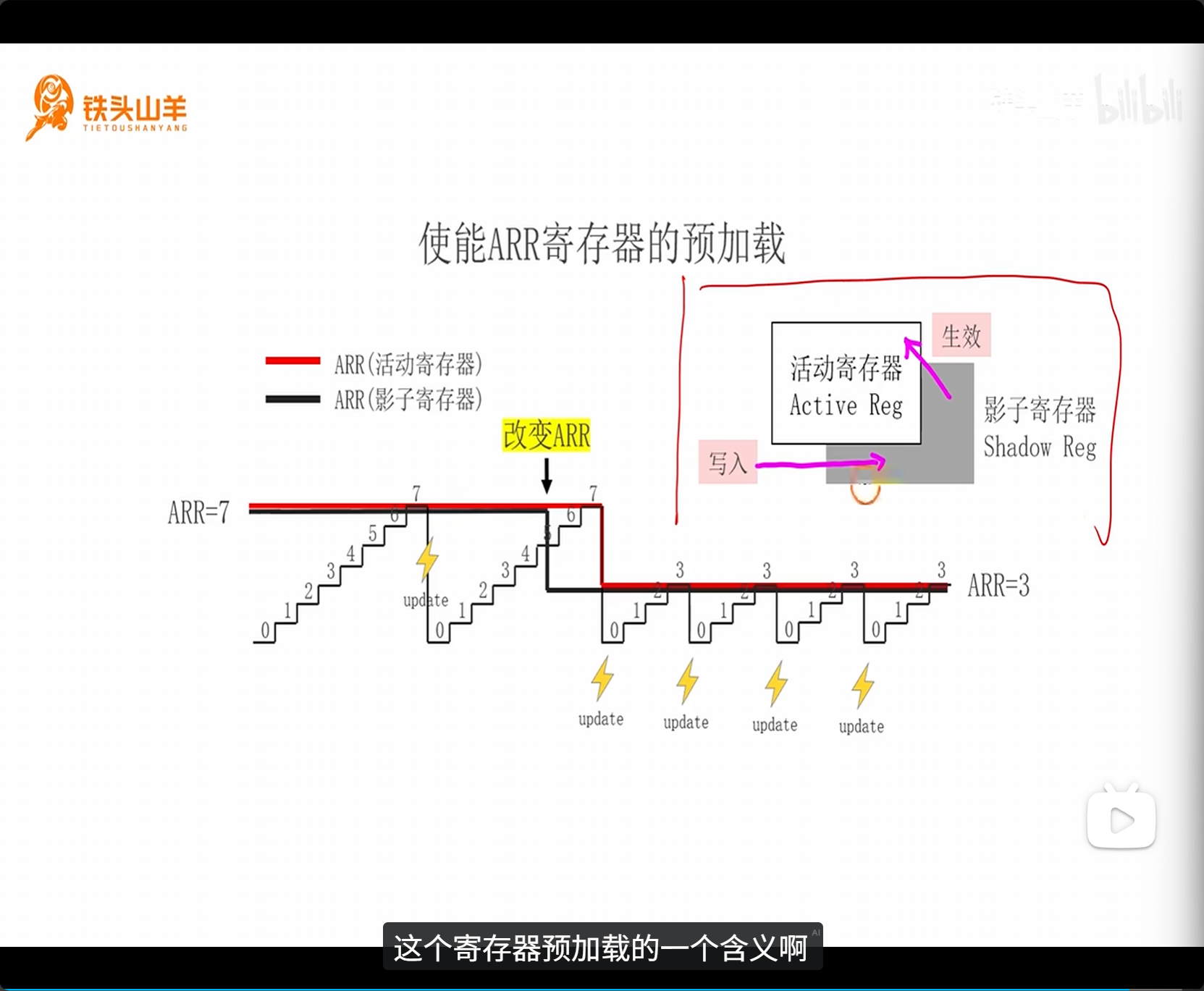 加入了预加载,在改变 ARR 后的第一个 update 事件更新处,活动寄存器的值被影子寄存器的值覆盖,这样定时器就不会跑飞哩。