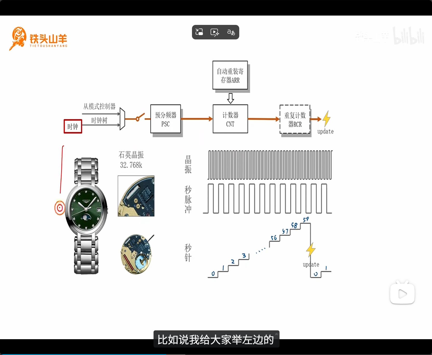 A:上图石英手表的结构可和时基单元类比。石英手表拆开后内部有个32.768KHZ 的石英晶振。如果直接驱动秒针会太快,所以内部有电路用来降低时钟频率,相当于预分频器,这样就可以驱动秒针。