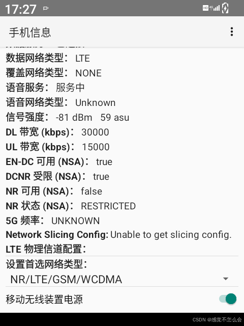 但是本次修改后未生效,仍然会掉到4G。查看系统设置中的首选网络类型,显示仅5G,切换4G模式,网络变化;切换5G自动模式,网络变化;再次切换仅5G,网络没有变化,怀疑网络模式设置失败。
