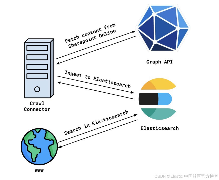 一个计划抓取(crawl)会启动,使用 Graph API 遍历 Sharepoint Online 实例的内容,然后将其存储到 Elasticsearch 或其他提供良好搜索能力的数据库中。对于用户需要搜索的每个系统重复这个过程,数据就存储在 Elasticsearch 中,并且可以很容易地通过你的网站进行搜索!这就是我们现有 Elastic content connectors 的工作方式。