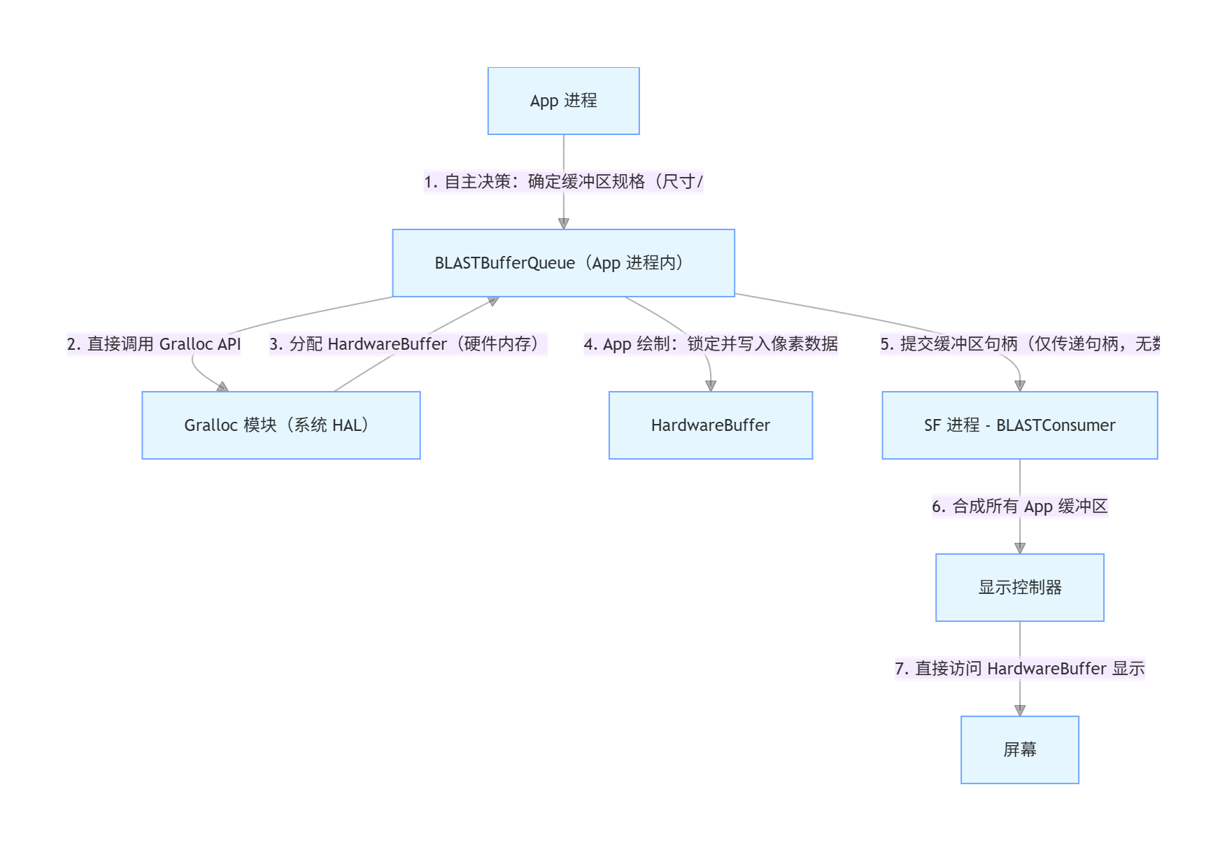 很多开发者误以为 BLASTBufferQueue 让 App "直接分配" HardwareBuffer,实则不然: