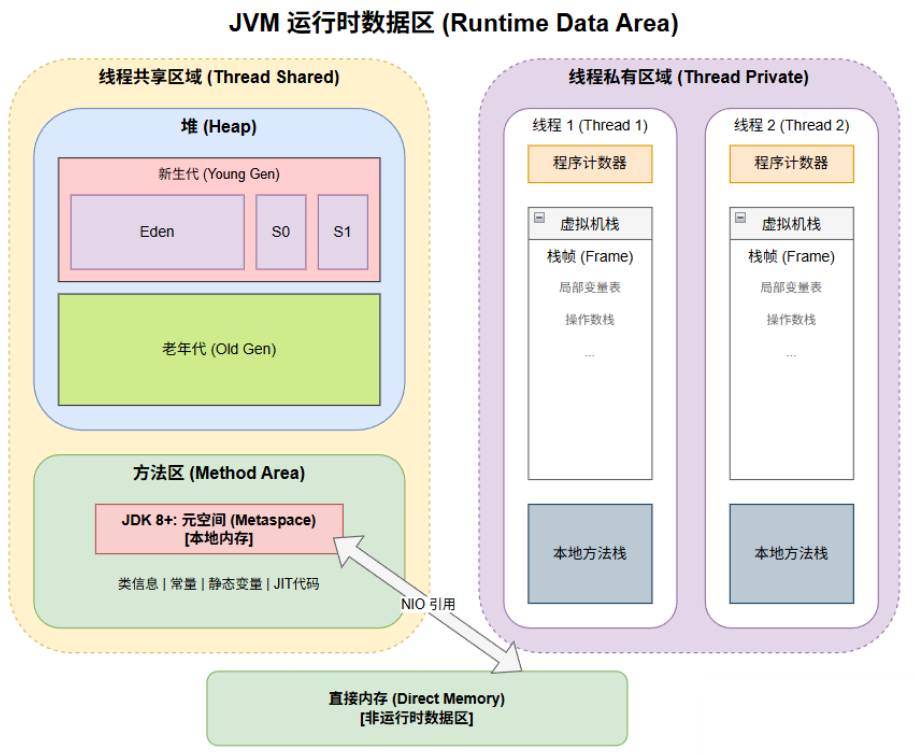 | JDK8+ | 方法区实现为 元空间 Metaspace(使用本地内存) |