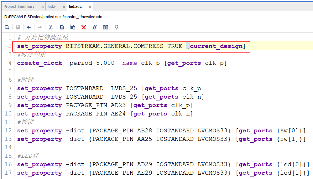 在 Vivado 中,可以通过在 .xdc 文件中添加以下约束来启用压缩功能。XDC 约束代码: