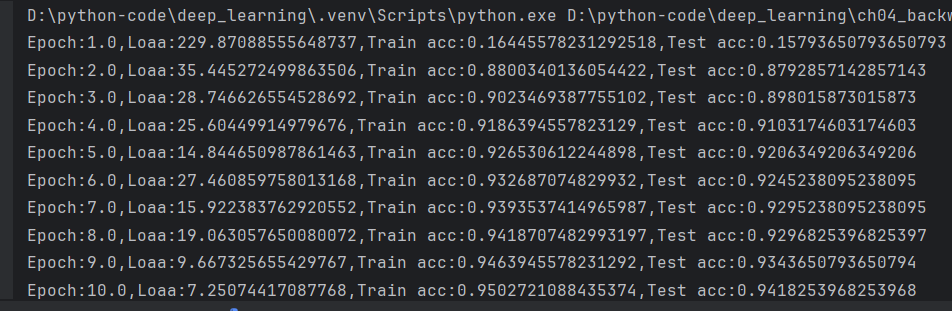 print('Epoch:{},Loaa:{},Train acc:{},Test acc:{}'.format(i//iter_per_epoch+1,loss,train_acc,test_acc))