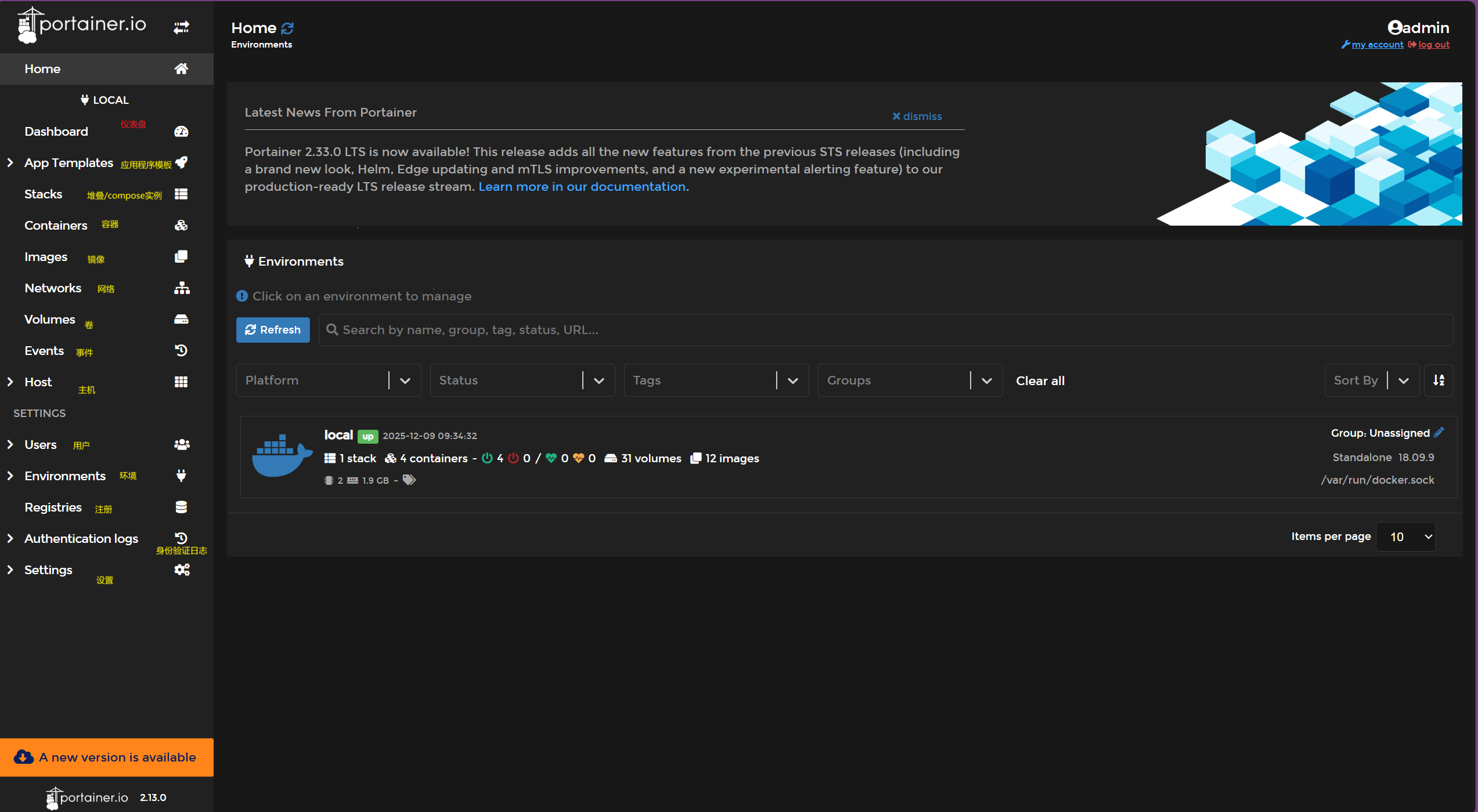 首次进来时,需要创建 admin 的用户名(默认admin)、密码(必须满足校验规则)。然后选择 local管理本地docker,即可看到本地Docker的详细信息,包括其中的镜像(images)、容器(containers)、网络(networks)、容器卷(volumes)、compose编排(stacks)等等。
