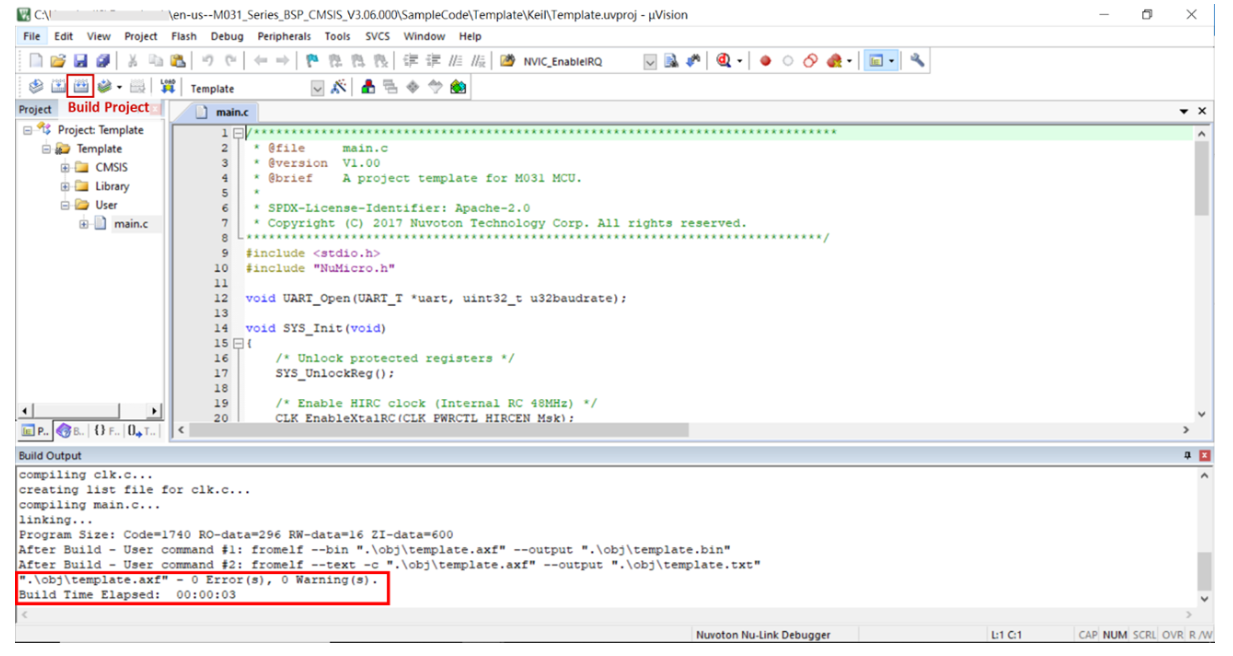 - 根据以下路径开启 "Template.uvproj(x)" 专案:Mxx_Series_BSP\SampleCode\Template\Keil