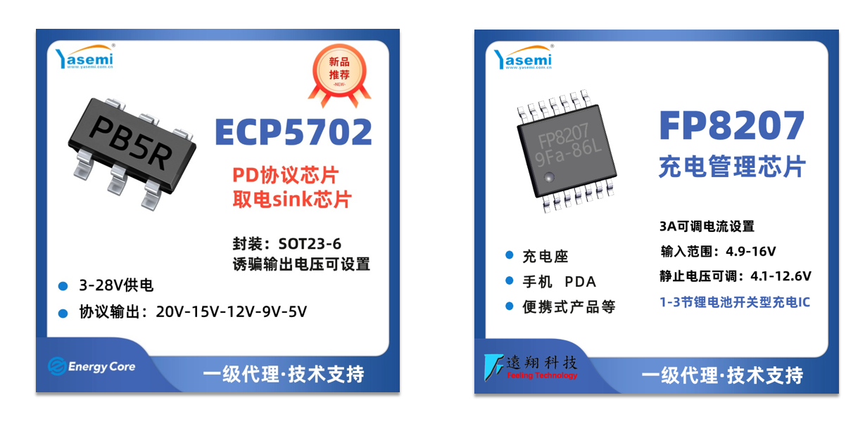 这套方案外围简洁、体积小巧,能够从普通PD充电器获取最大功率,为各类便携设备提供安全可靠的3A快充体验。这颗ECP5702 还 适配多款不同品牌的充电芯片 (附表) ,实现快充功能。