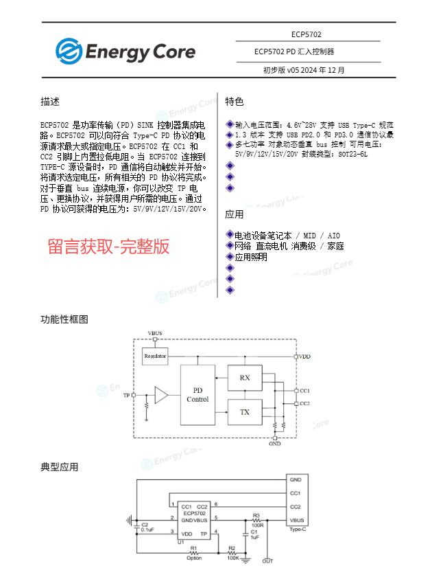 前端: ECP5702作为PD SINK控制器,智能与PD充电器通信,可请求5V/9V/12V/15V/20V多种电压
