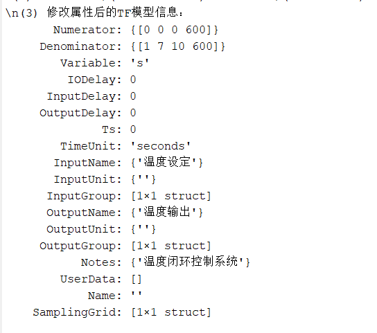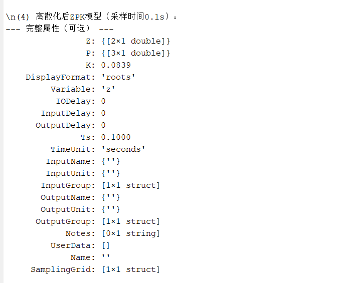 set命令修改TF模型属性(输入名、输出名、备注),并查看; - (4)将ZPK模型离散化(采样时间0.1s),查看离散化后属性。