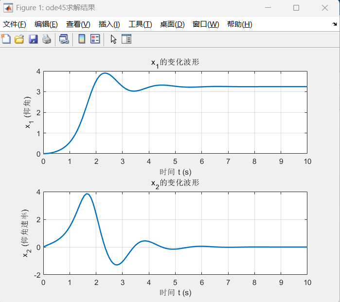 xlabel('时间 t (s)'); ylabel('x_1 (仰角)');