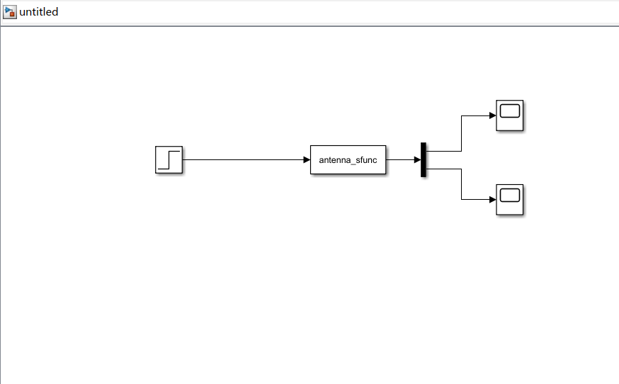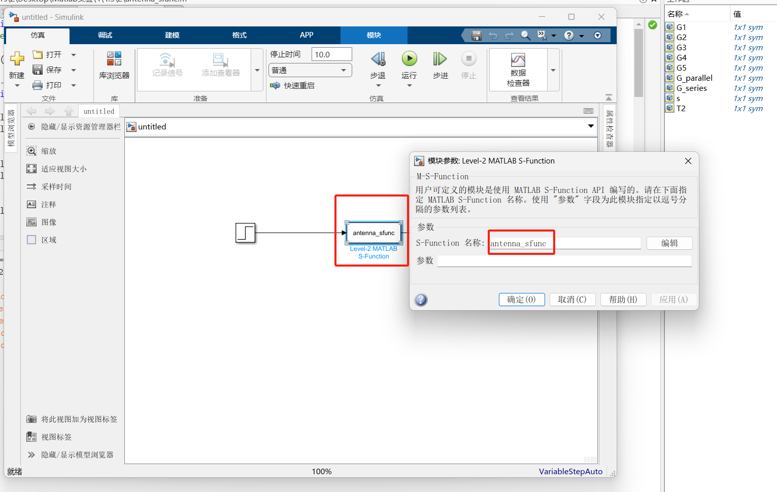 Simulink/User-Defined Functions中拖拽S-Function,双击模块,在S-function name中输入sfun_antenna(加载编写的S函数)【注意S函数要用Level 2的那个】
