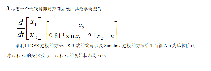 DEE(Differential Equation Model)即通过微分方程描述系统的动态行为。实验三中的天线臂系统是典型的非线性微分方程系统(含 sin x 1 \sin x_1 sinx1项),其状态方程可整理为: