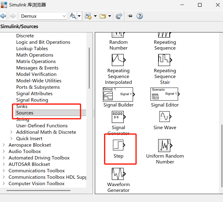 Simulink/Sources中拖拽Step(单位阶跃,默认参数:Step time=0,Amplitude=1);