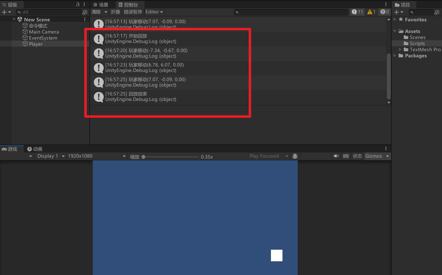 将玩家和输入采集脚本挂载到场景中的一个方块上,并拖动方块的位置,每拖动一次点击游戏面板按下W键记录一次,多记录几次后按下S键就可以看到方块沿着我们之间记录位置的顺序移动了,并且控制台打印出了对应的结果。