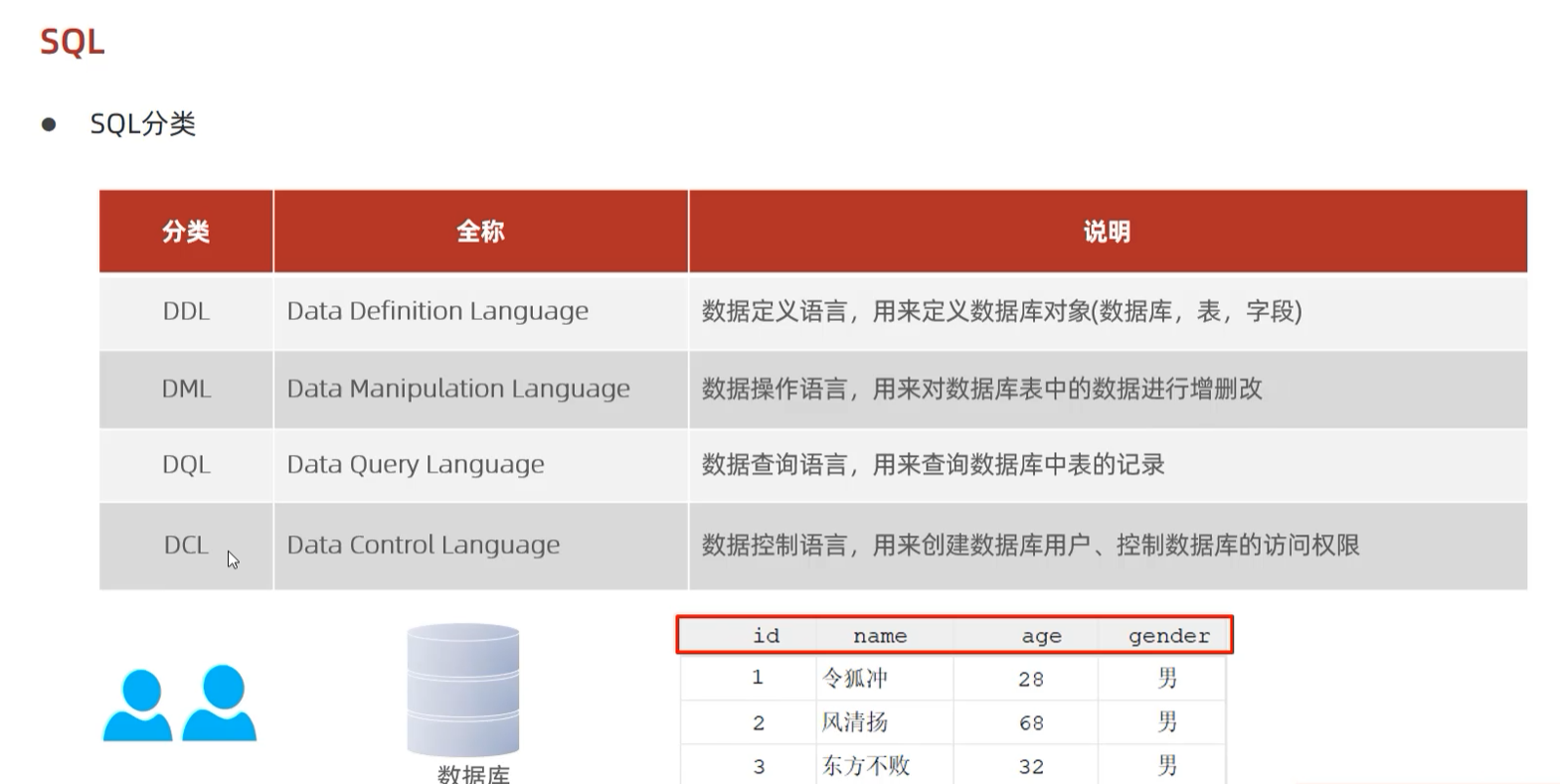 SQL根据功能划分为四大类:数据定义语言(DDL)、数据操作语言(DML)、数据查询语言(DQL)、数据控制语言(DCL)。