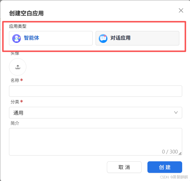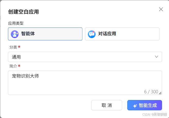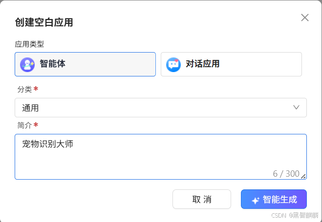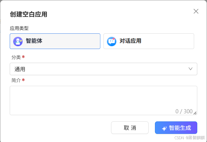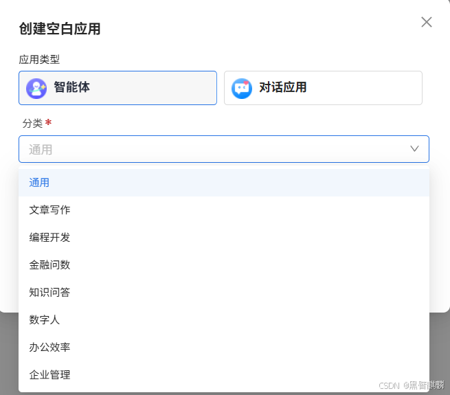弹框的类型中可以选择 "智能体" 或 "对话应用"。选择智能对话就下下面: