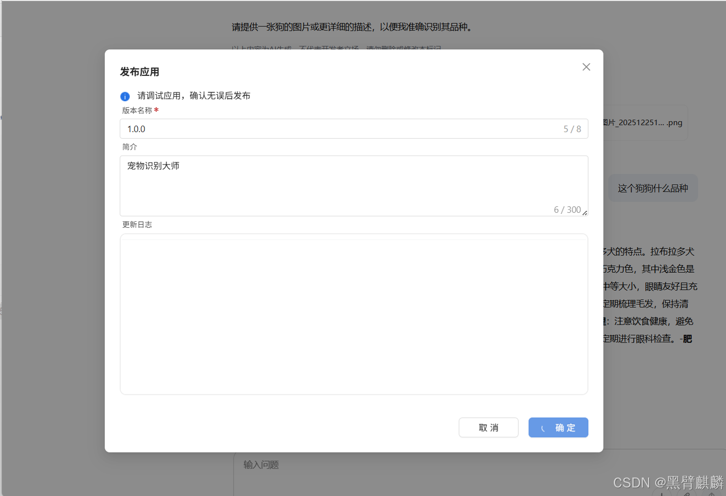华为 ModelEngine 会根据我们输入的简介内容(如"宠物识别大师"),自动生成应用名称、图标以及核心的提示词(Prompt)。