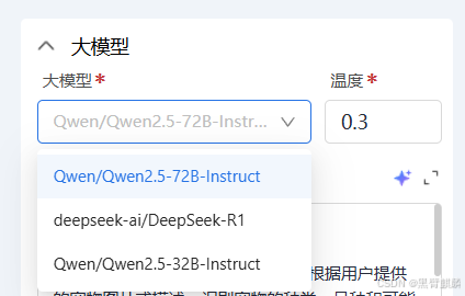 再大模型栏中,集成千问大模型和deepseek-R1,温度是来控制我们的回答的拟人口吻和严谨性。
