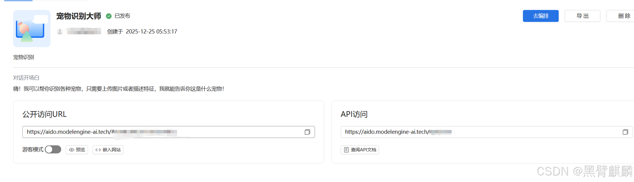 妹妹比较喜欢动物,但是对动物市场得时候又没发分辨各种动物得种类合品种。我想到如果一个app可以集成一个AI只能题可以拍照上传图片识别就好了。然后遇到华为ModelEngine得在线生成智能体工具。官方地址:ModelEngine网站